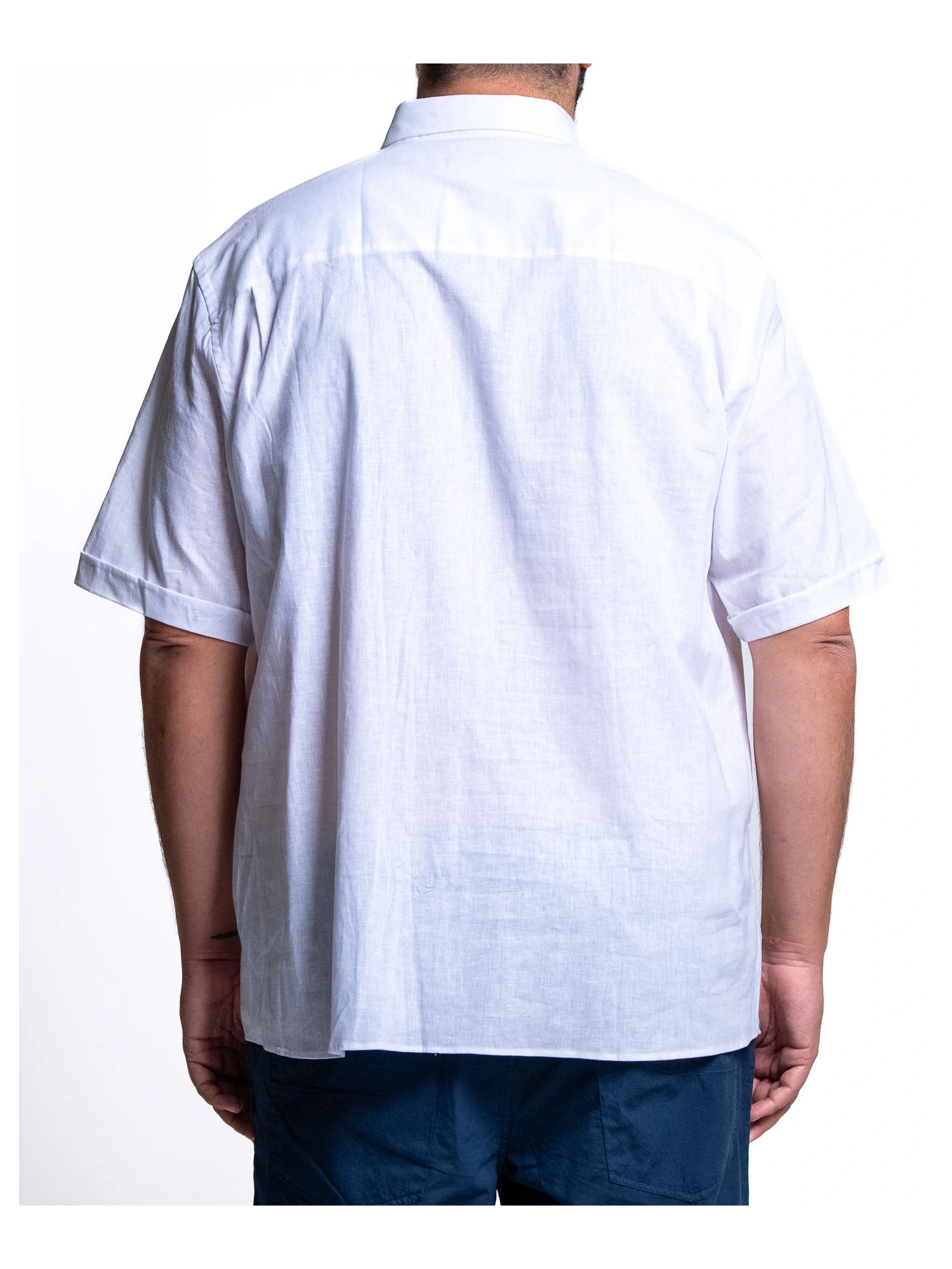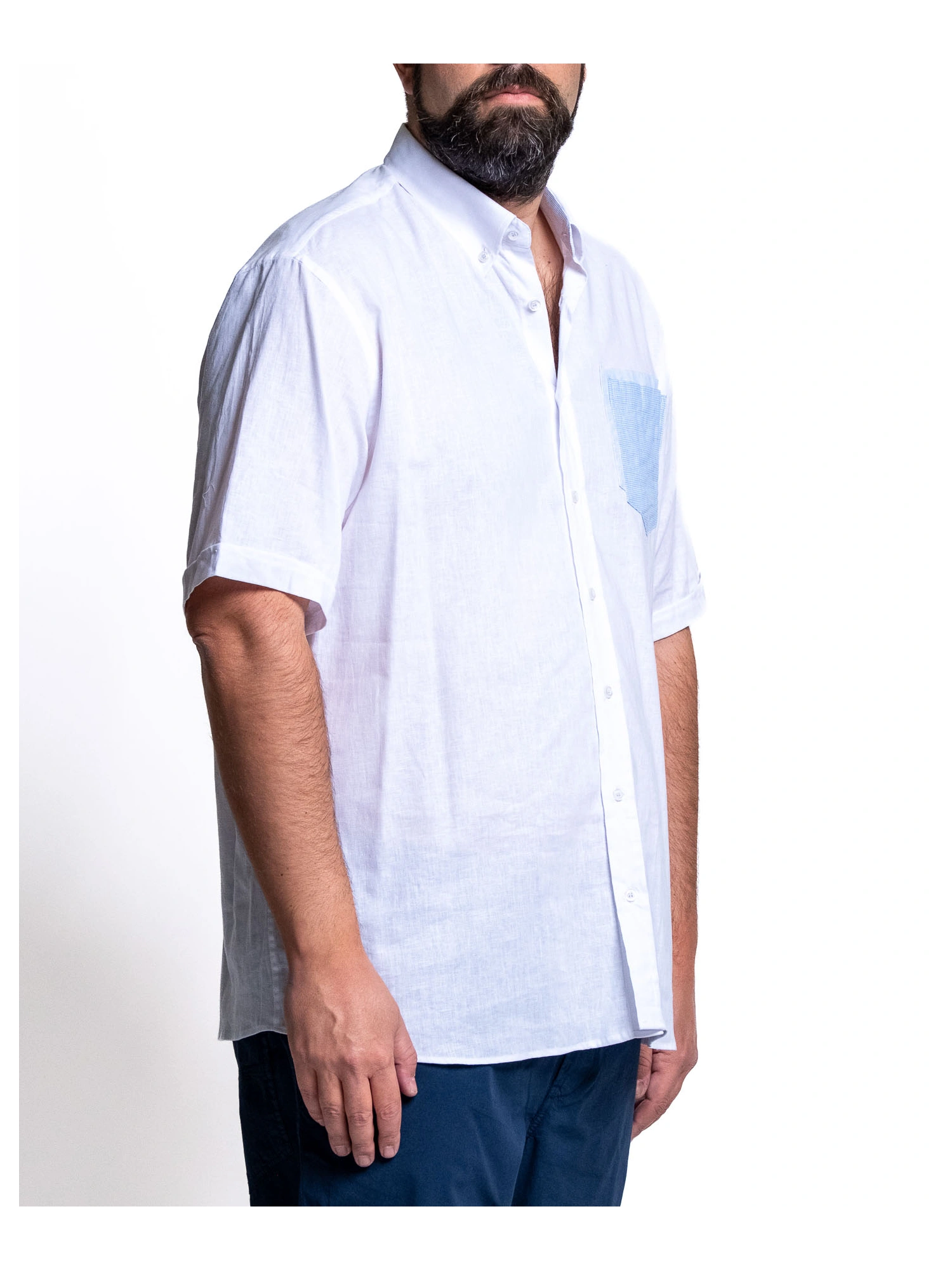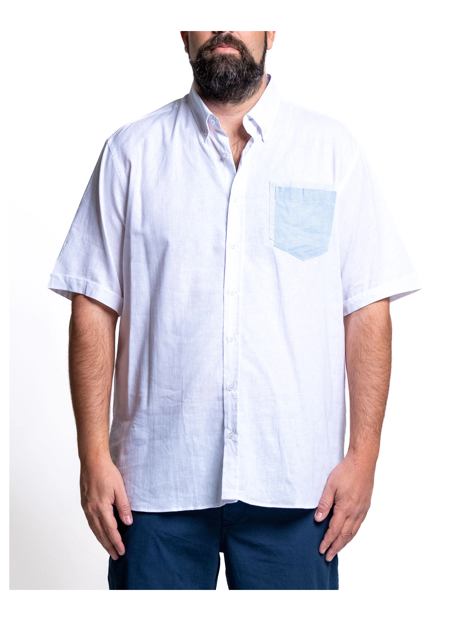 SHORT-SLEEVED LINEN BLEND SHIRT. CLASSIC COLLAR WITH FRONT BUTTONING. PATCH POCKET WITH CONTRASTING MICRO-PRINTED FABRIC INSERT. SLIGHTLY ROUNDED HEM. COMFORTABLE AND NATURAL FIT, IDEAL FOR WARM WEATHER. SIZES 1XL - 8XL. COMPOSITION 55% LINEN 45% COTTON. FRESH, BRIGHT, AND CAFETERIA. THIS SHIRT IS DESIGNED TO ACCOMPANY YOU ON THE WARMEST DAYS WITH A RELAXED YET RESEARCHED STYLE. LINEN PROVIDES BREATHABILITY, CONTRASTING INSERTS ADD PERSONALITY, AND THE LOOSE FIT LEAVES YOU FREE TO MOVE AND BE YOURSELF, WITHOUT COMPROMISE. WEAR IT, BREATHE IT, AND EXPERIENCE SUMMER YOUR WAY.