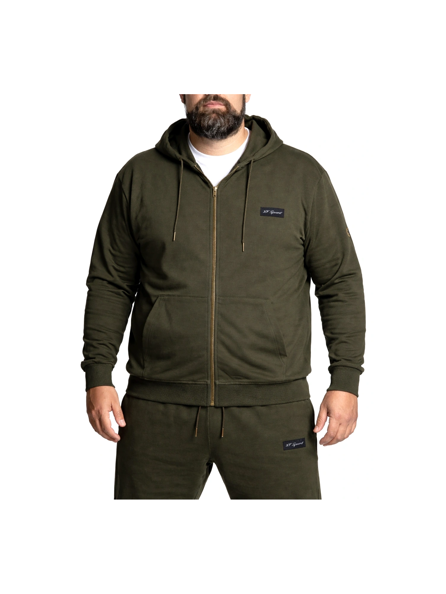 HOODED SWEATSHIRT WITH ZIP CLOSURE, MADE WITH A CLEAN LINE AND COMFORTABLE FOR EVERYDAY WEAR. THE MODEL IS COMPLETED WITH AN ADJUSTABLE DRAWSTRING, FRONT POCKETS AND RIBBED TRIM ON THE CUFFS AND BOTTOM, DETAILS THAT GIVE THE ITEM A NEAT AND FUNCTIONAL FIT. THE LOGO APPLIED ON THE CHEST ADDS A DISCREET SPORTY ATTRACTION. AVAILABLE IN NAVY BLUE, MILITARY GREEN AND BLACK. SIZES 2XL - 10XL COMPOSITION 100% COTTON PRACTICAL, MODERN AND EASY TO MATCH, THIS SWEATSHIRT IS THE ITEM THAT INSTANTLY GIVES YOUR OUTFIT A DECISIVE AND CONTEMPORARY IMPRESSION. IT HAS A SPORTY SPIRIT, BUT IT MOVES WITH EASE EVEN IN ITS FREE TIME, THANKS TO AN ESSENTIAL STYLE THAT KNOWS HOW STRONG IT IS WITHOUT WEIGHING IT DOWN. IN SHADES OF NAVY BLUE, MILITARY GREEN, AND BLACK, IT EXPRESSES THREE SHADES OF PERSONALITY, BUT ALWAYS MAINTAINS THE SAME IDEA OF COMFORT, PRESENCE, AND VERSATILITY.