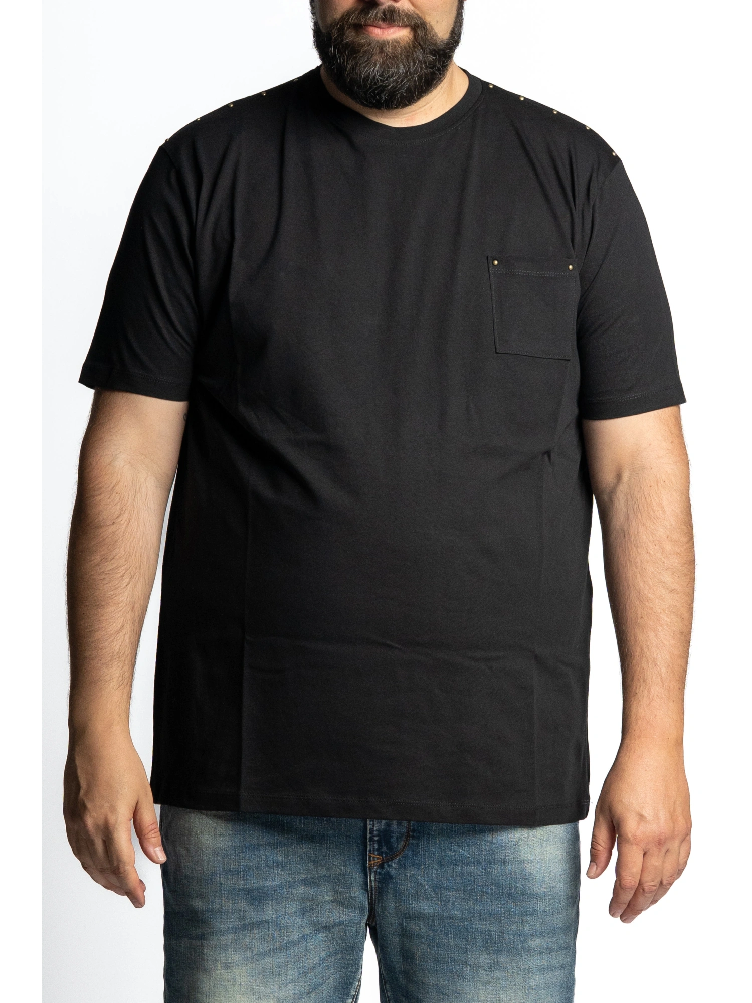 CREW NECK SHORT SLEEVE T-SHIRT IN COTTON JERSEY, COMFORTABLE AND STRAIGHT FIT. APPLIED CHEST POCKET AND MICRO METAL STUDS ALONG THE SHOULDERS AND ON THE POCKET, STRAIGHT BOTTOM AND FINISHED HEM AT THE ARMHOLES. SIZES 1XL 7XL THIS T-SHIRT IS THE ROCK DETAIL THAT INSTANTLY RAISES THE LEVEL OF ANY LOOK: THE STUDS ON THE SHOULDERS BRIGHTEN UP THE SILHOUETTE AND THE POCKET GIVES THAT CASUAL TOUCH THAT LOOKS GOOD WITH BOTH RIPPED JEANS AND CLEANER TROUSERS. PUT IT ON AND YOU'RE READY FOR THE CITY OR A CONCERT
