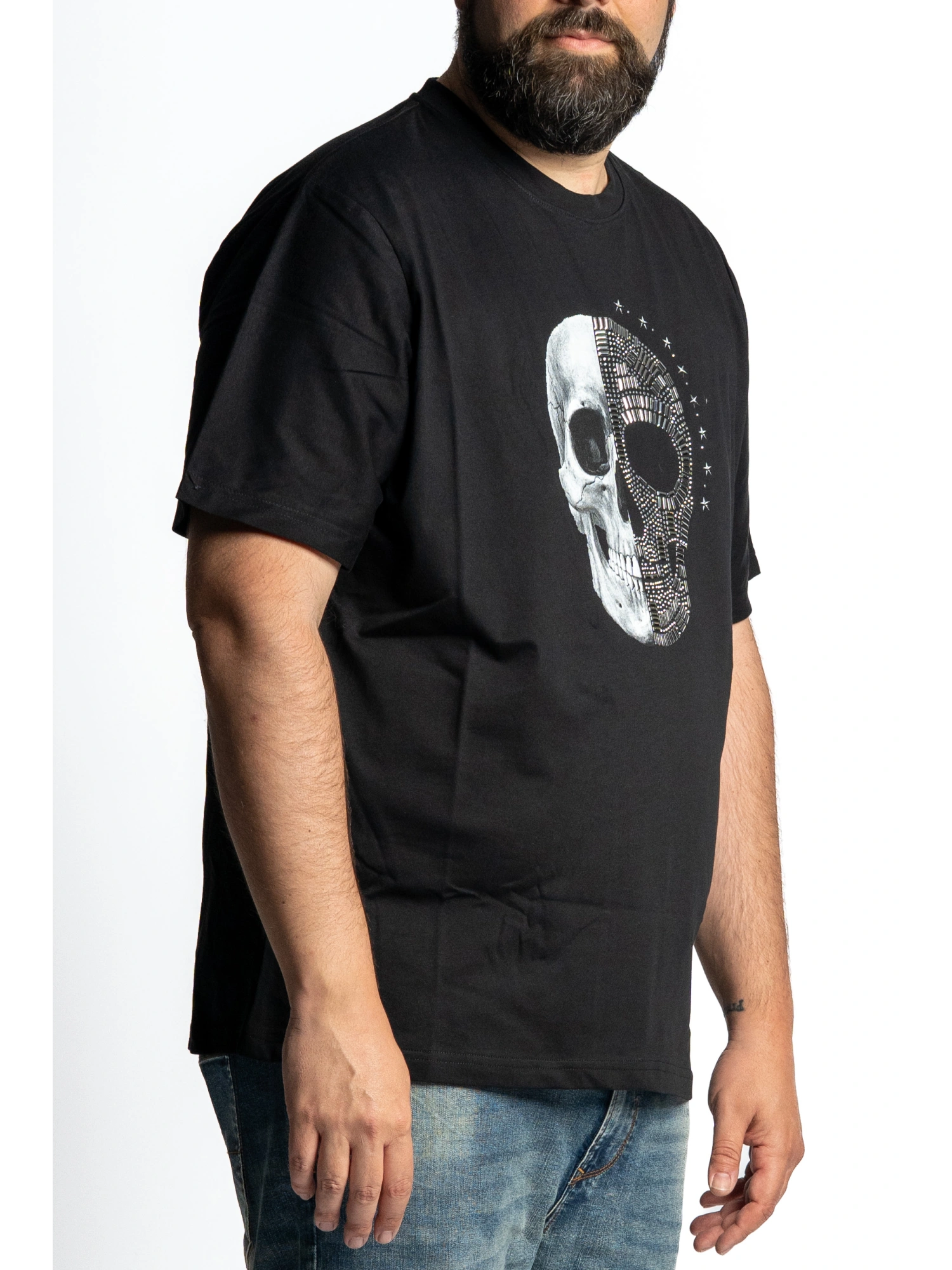 CREW NECK T-SHIRT WITH SHORT SLEEVES IN COTTON JERSEY, COMFORTABLE FIT, TYPICAL BLOCK 38. FRONT CENTRAL PRINT WITH SKULL SPLIT IN HALF: ONE SIDE WITH A PHOTOGRAPHIC EFFECT, THE OTHER A GRAPHIC DESIGN ENRICHED BY APPLIED MICRO STUDS THAT CREATE A PLAY OF LIGHT. BOTTOM AND SLEEVES WITH STIPPED HEM, SMOOTH BACK, CLEAN LINE EASY TO MATCH WITH JEANS AND CARGO JACKETS. COMPOSITION 100% COTTON SIZES 1XL 7XL WHEN THE EVENING CALLS AND THE MUSIC TURNS UP, THIS T-SHIRT BECOMES YOUR UNIFORM: ONE DARK SIDE, ONE BRIGHT, LIKE THE TWO FACES OF THE SAME NIGHT. YOU PUT IT ON AND IMMEDIATELY THE LOOK TAKES ON GRIT, EFFORTLESSLY, WITH THAT ROCK TOUCH THAT MAKES YOU LEAVE THE HOUSE READY TO FIND YOURSELF AT THE CENTER OF THE SCENE.
