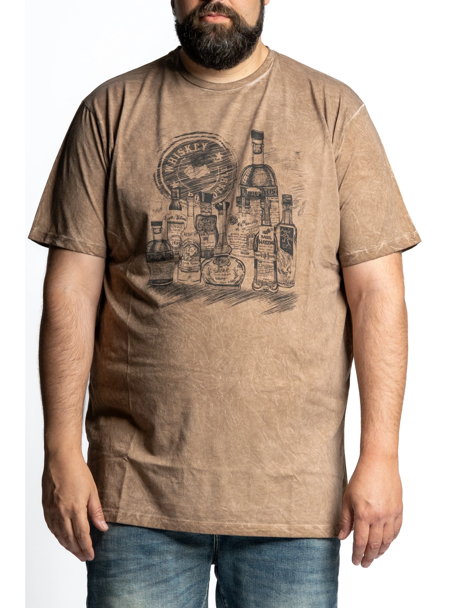 CREW-NECK JERSEY T-SHIRT, SHORT SLEEVES, COMFORTABLE FIT. COLD-DYED FOR A WORN, TEXTURED EFFECT. FRONT PRINT IN ILLUSTRATION STYLE WITH A SET OF WHISKEY BOTTLES. STRAIGHT BOTTOM. SIZES 2XL - 8XL. 100% COTTON. THAT T-SHIRT THAT INSTANTLY MAKES YOU SAY "THE RIGHT NIGHT": PAIR IT WITH JEANS AND CLEAN SNEAKER, AND YOU'RE READY TO GO FROM WORK TO APERITIF WITHOUT CHANGE IN ENERGY. THE GRAPHICS HAVE THAT COLLECTOR'S FLAVOR, LIKE A PIECE FOUND IN A SECRET PLACE IN THE CITY. IT SHINES WITH ECONOMICALITY, EVERY EXIT IS AN ENTRANCE.