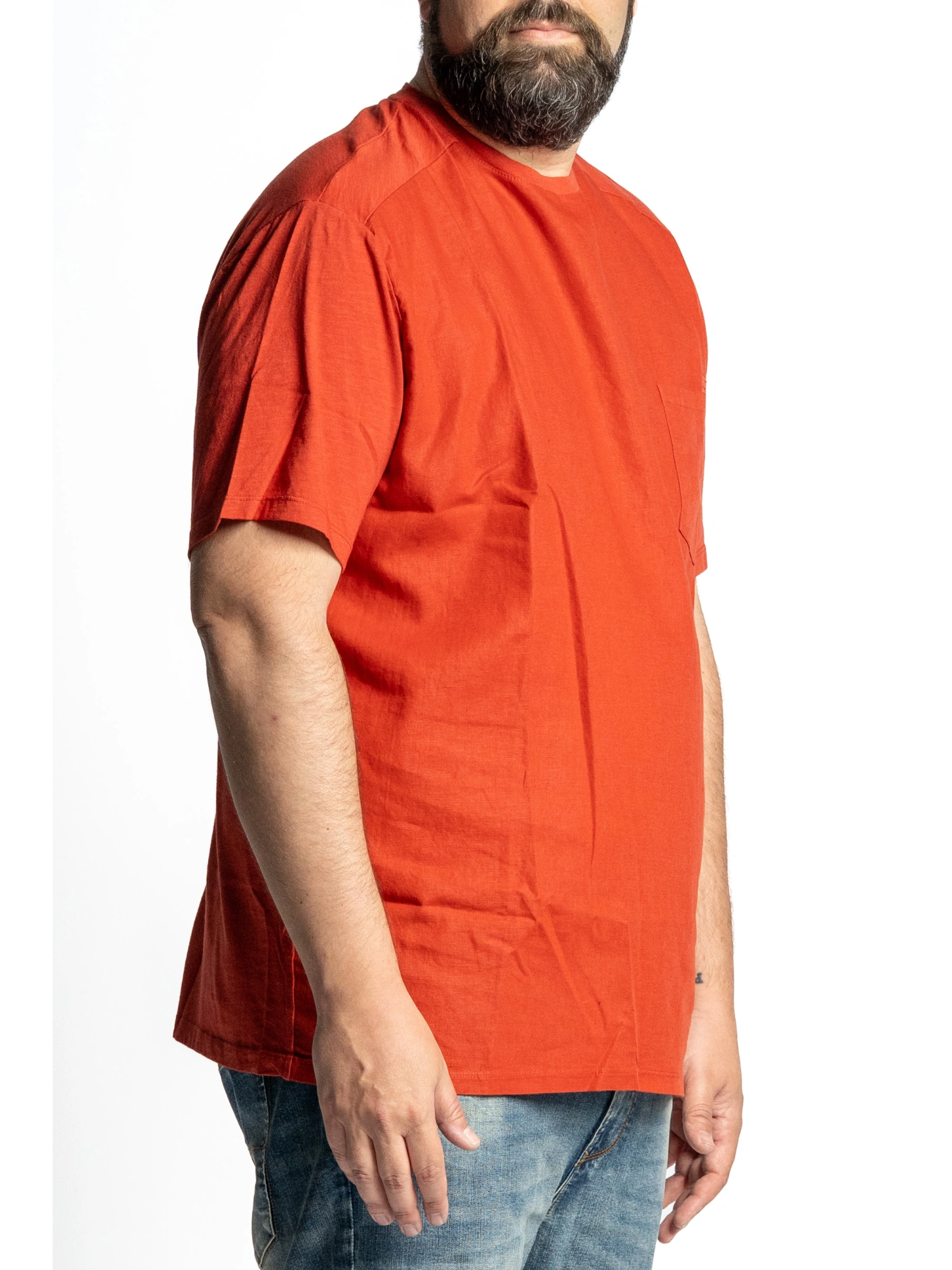 CREW NECK SHORT-SLEEVED T-SHIRT MADE FROM A LINEN AND COTTON BLEND, DESIGNED TO ENSURE LIGHTNESS AND BREATHABILITY. COMFORTABLE FIT, CLEAN AND LINEAR STRUCTURE. CHEST POCKET WITH DECORATIVE NATURAL-THEMED LABEL, STRAIGHT BOTTOM AND ESSENTIAL STITCHING. SIZES 2XL - 8XL COMPOSITION 55% LINEN 45% COTTON T-SHIRT THAT APPRECIATES AT FIRST CONTACT. LIGHT, AIRY, WITH THAT KIND OF DISCREET ELEGANCE THAT DOESN'T NEED TO BE OVERDUE. YOU PUT IT ON AND YOU IMMEDIATELY FEEL THE DIFFERENCE: MORE SPACE, MORE COMFORT, MORE STYLE. IT'S THE RIGHT ITEM WHEN YOU WANT TO FEEL WELL-Groomed, NATURAL, AND AT COMFORT WITH YOURSELF.