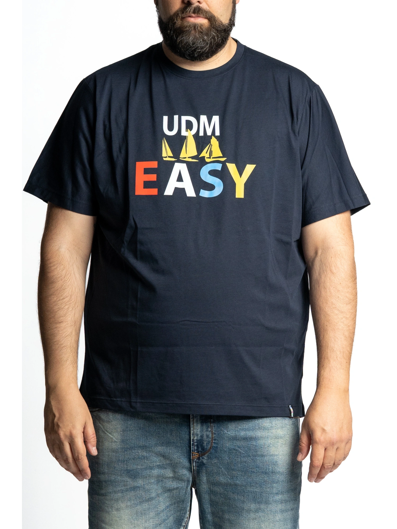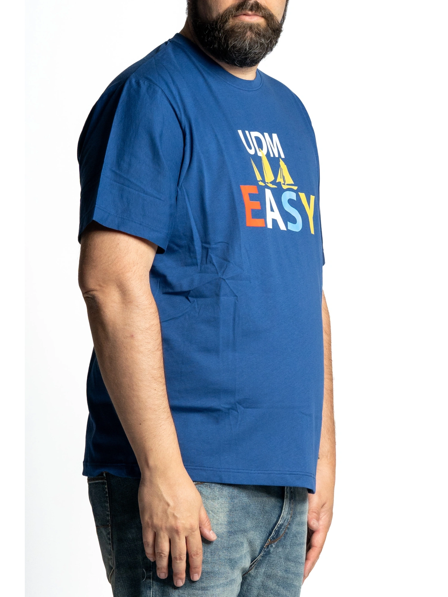 CREW NECK SHORT SLEEVE T-SHIRT WITH "UDM EASY" FRONT PRINT IN MULTICOLOR LETTERS AND SAILBOAT GRAPHICS. STRAIGHT BOTTOM, COOL AND BREATHABLE FABRIC, PERFECT FOR THE SUMMER SEASON. ATTENTION TO DETAILS FOR A SPORTY AND LIVELY LOOK. SIZES XL - 8XL COMPOSITION 100% COTTON THE SEA IS NOT JUST A PLACE, IT'S A LIFESTYLE. THIS T-SHIRT CAPTURES THE ESSENCE OF THOSE WHO LIVE LIFE WITH A FREE SPIRIT, WITHOUT FEAR OF CHANGING COURSE. THE BRIGHT COLORS AND SAILS SYMBOLIZE THE COURAGE, FRESHNESS AND LIGHTNESS TYPICAL OF MEN OF THE SEA. WEARING IT MEANS ALWAYS CARRYING WITH YOU A AIR OF VACATION AND ADVENTURE. MEN OF THE SEA, MEN OF STYLE!